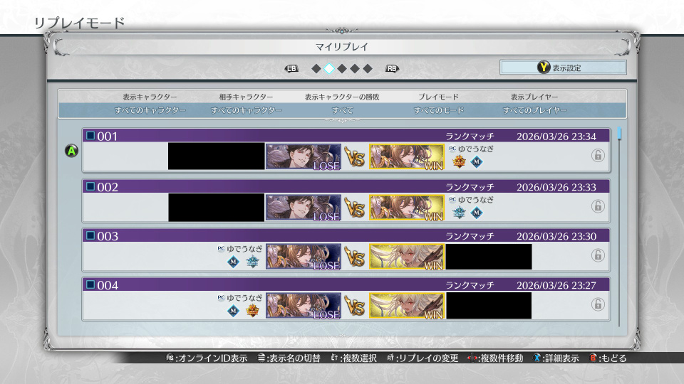 保存したリプレイはメインメニューの「リプレイ>マイリプレイ」で見れます。自分の対戦を見返すことは上達に役立つのでリプレイ自動保存はONにすることをお勧めします。