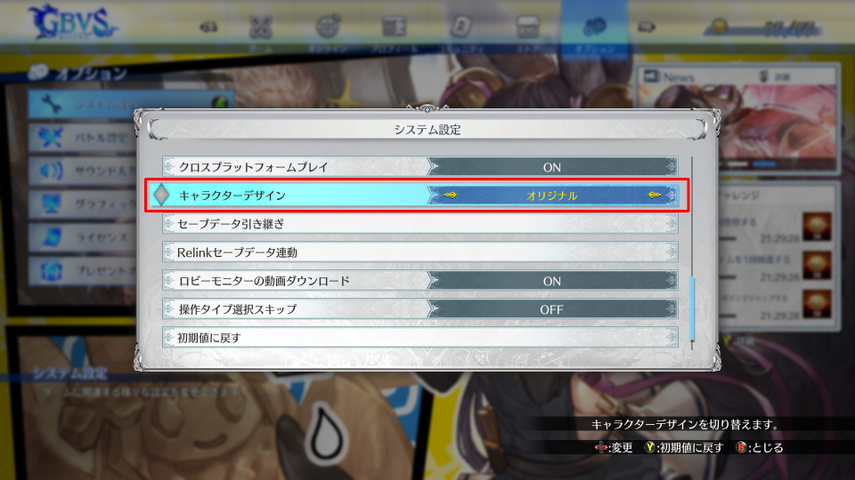 この設定は一部キャラクター(メーテラ・ゼタ・ナルメア・ユエル)の衣装を変更するためのオプションで、デフォルトのGBVSだと“配慮”された衣装になります。
