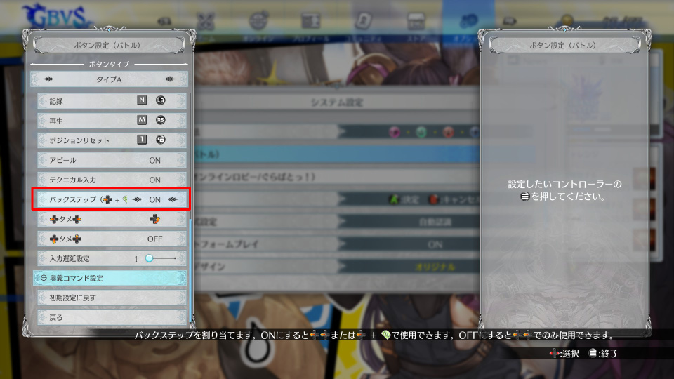 バックステップはとっさに出したいことが多いのでONにすることをお勧めします。