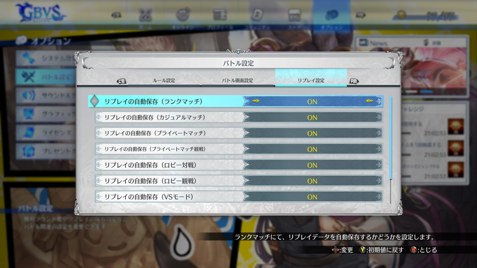 リプレイ設定で自動保存は全てONにしましょう。デフォルトだと対戦後に任意でリプレイを保存しますがONにすると自動で保存してくれます。