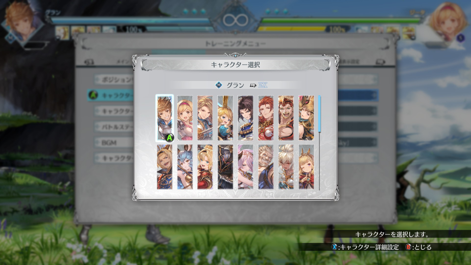 「簡易設定変更」内の「キャラクター(1P)」「キャラクター(2P)」を選択することでキャラクターを変更することが出来ます。また、この時にグランなど一部キャラクターを選択時にRボタンを押すと性能の違うEXキャラクターを選択することが出来ます。