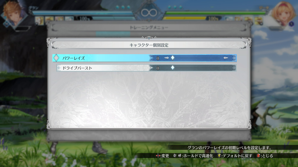 「ゲージ設定」ページではHPゲージや奥義ゲージなどの設定が行えます。トレーニングモードではHPは自動回復し、アビリティもすぐ再使用できるようになっていますがここの設定で通常の対戦と同じようにすることもできます。
